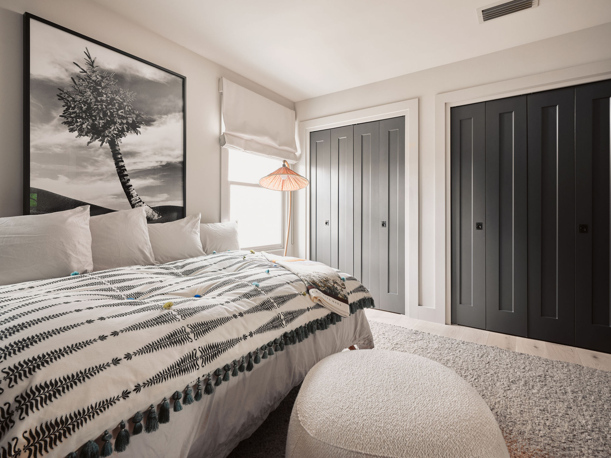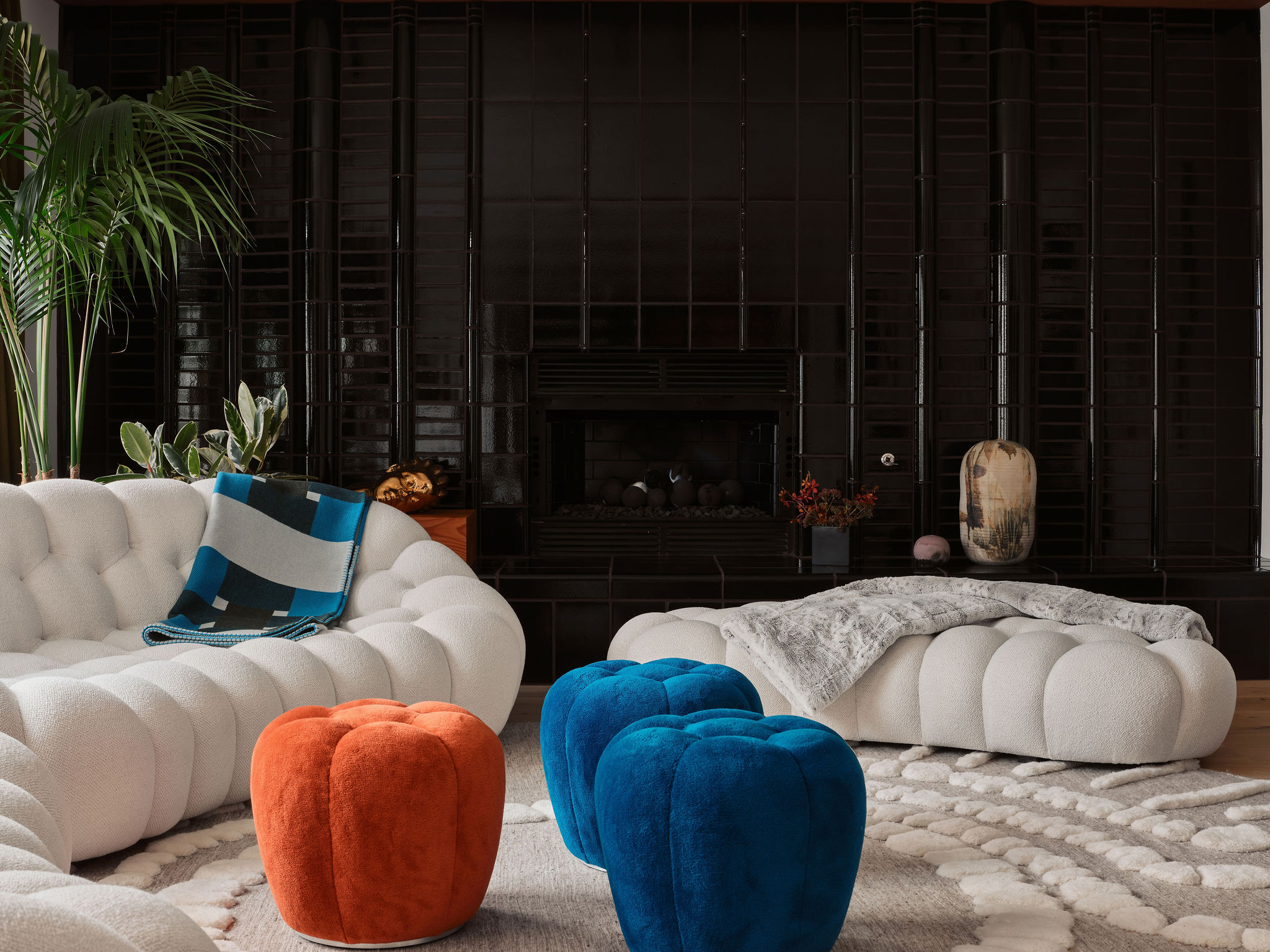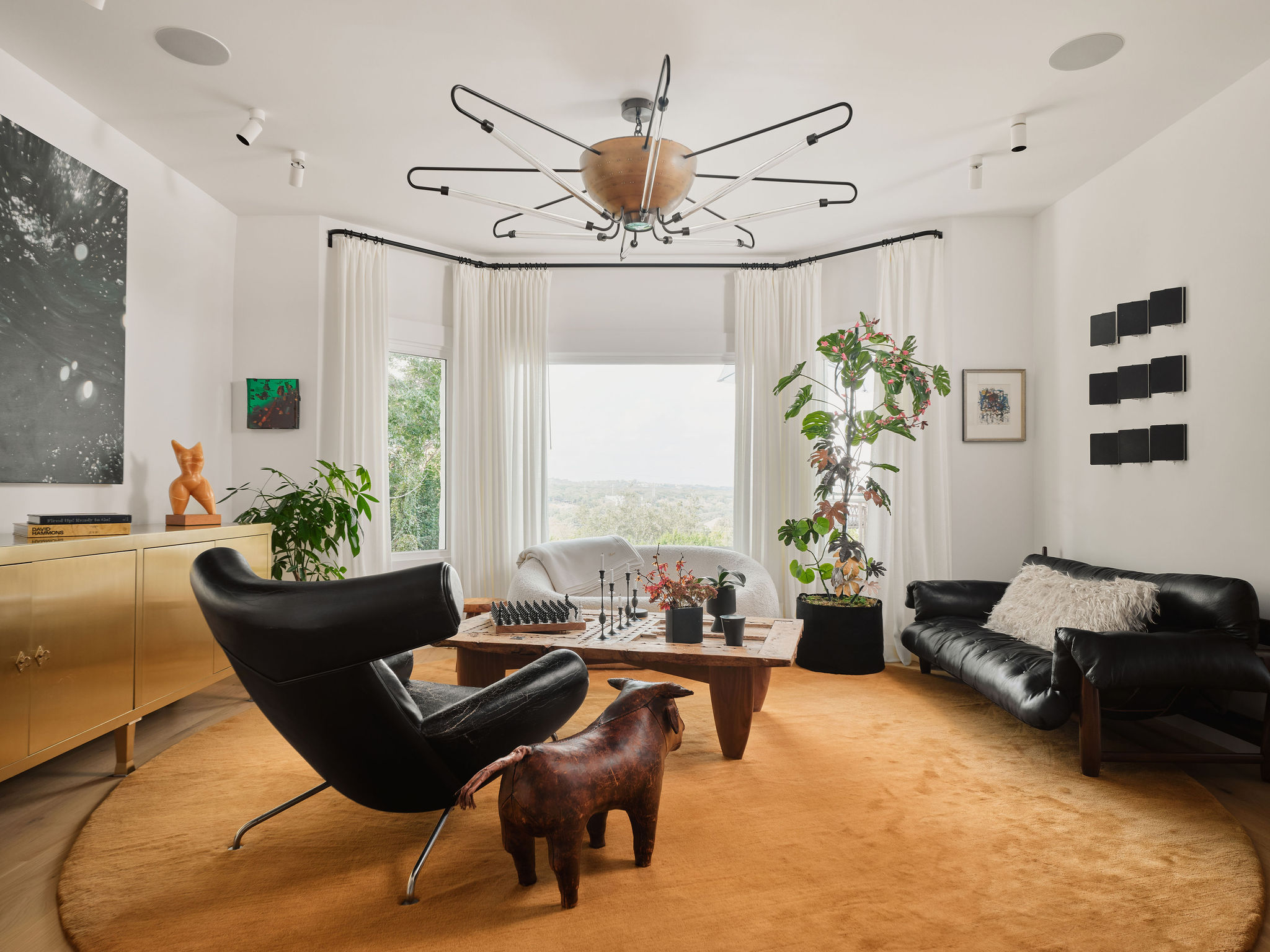 • The den is anchored by a cozy fireplace and sculptural wall of black glazed brick. Wrapped in rich textures and complete with blackout shades for total light control, this space easily transitions from a relaxed daytime lounge to a modern sanctuary for television, music or quiet evenings.