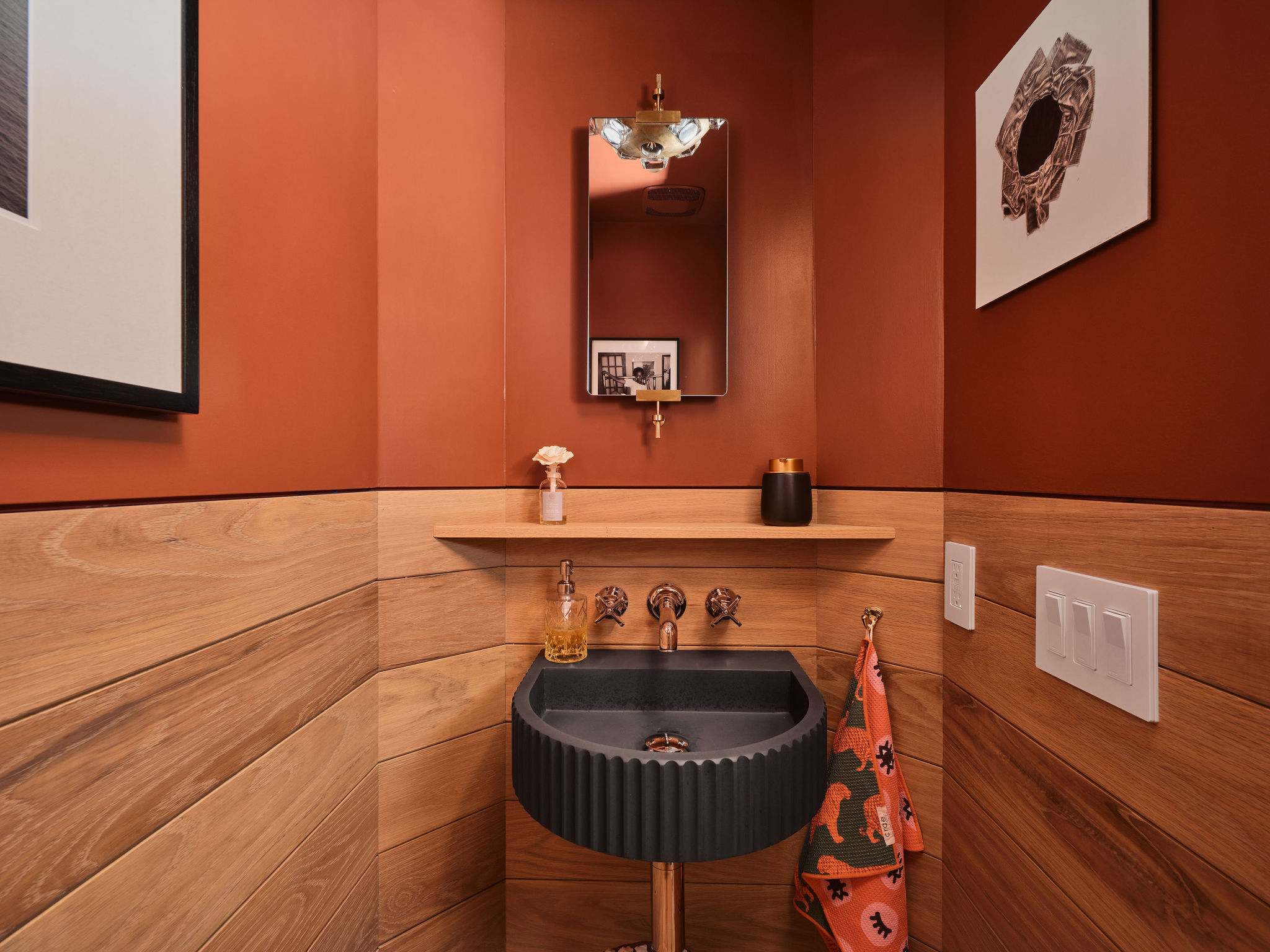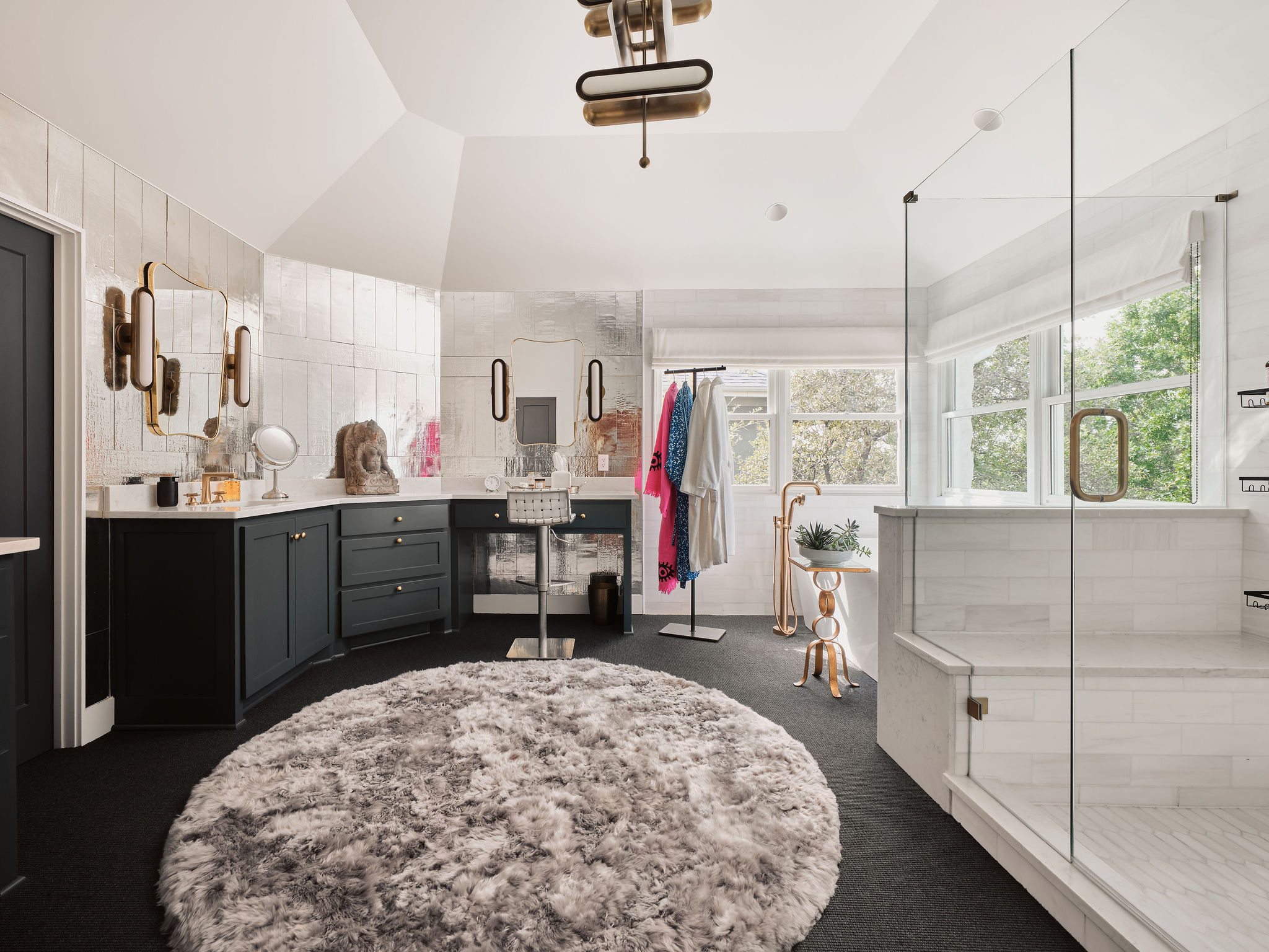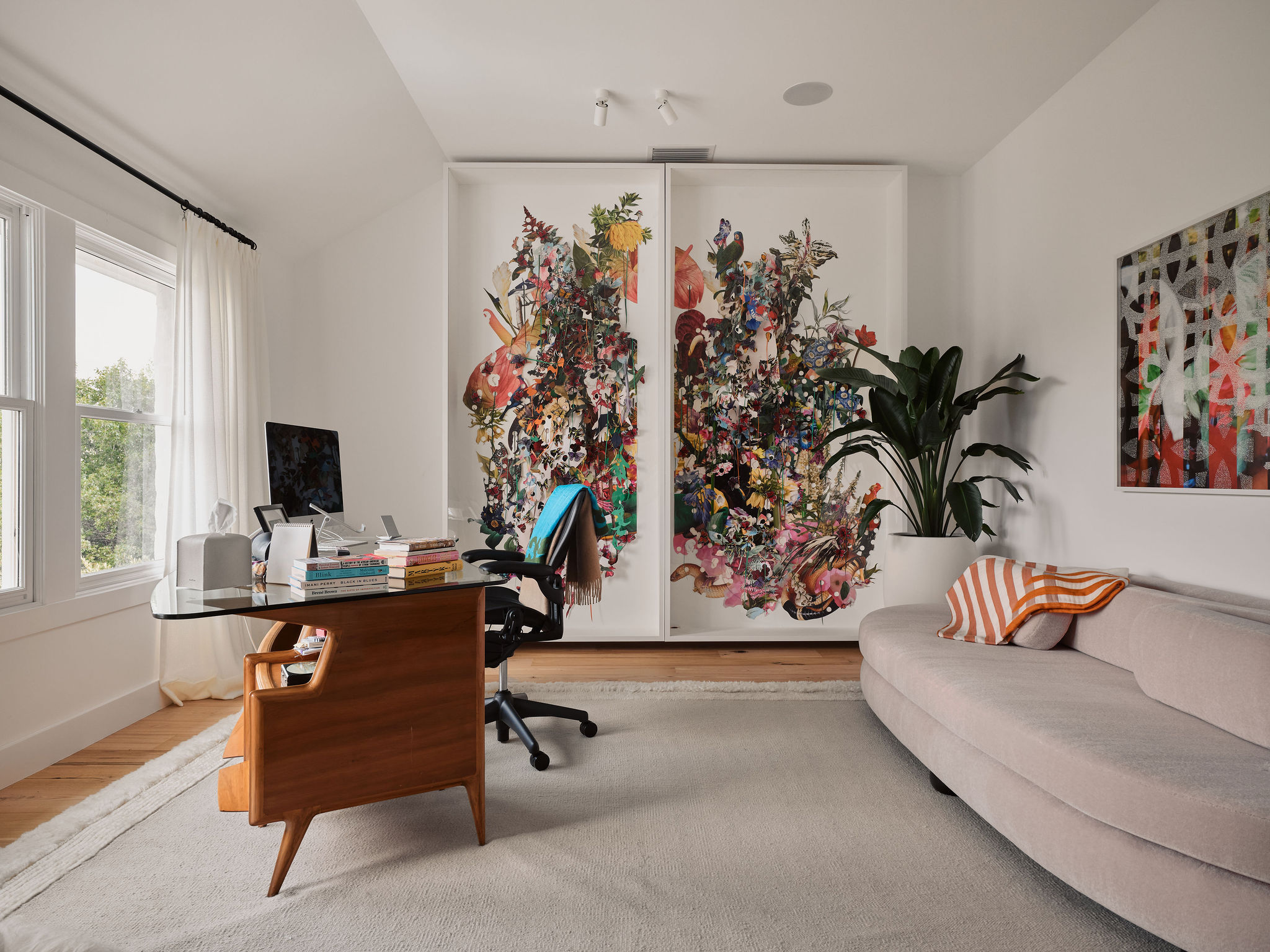 • The den is anchored by a cozy fireplace and sculptural wall of black glazed brick. Wrapped in rich textures and complete with blackout shades for total light control, this space easily transitions from a relaxed daytime lounge to a modern sanctuary for television, music or quiet evenings.
