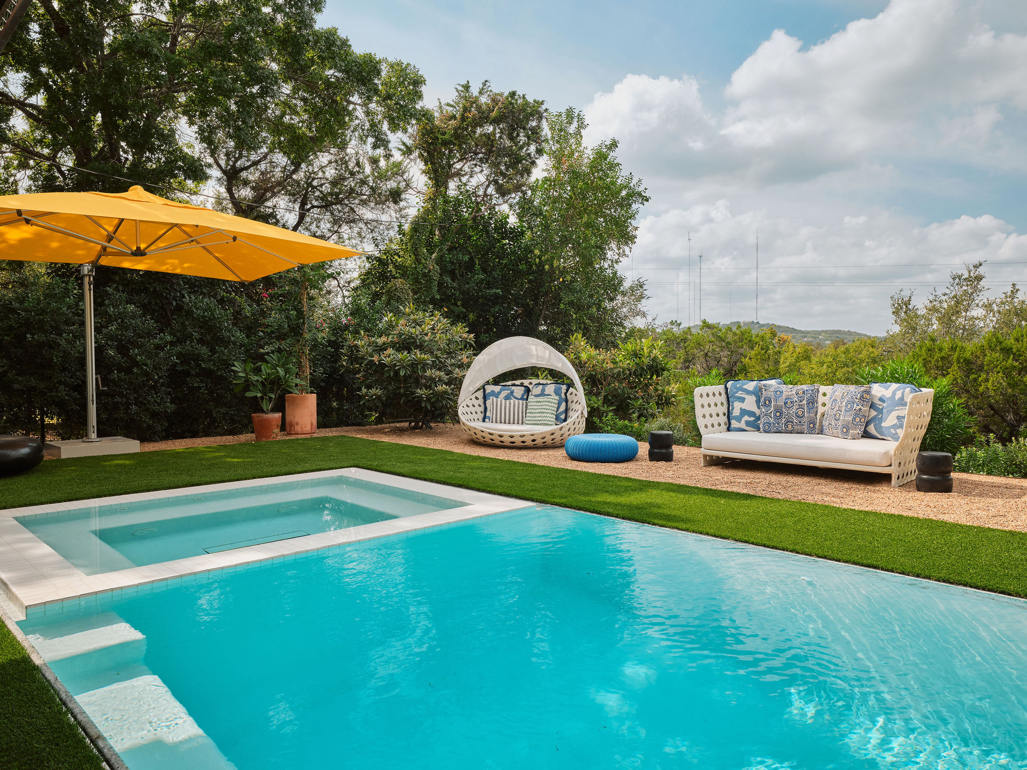 • Stepping outside, the landscape by Word+Carr transforms the grounds into an oasis: lush planting, carefully curated hardscapes, outdoor living zones and privacy thoughtfully achieved. Mature Red Oak trees provide a graceful canopy over ornamental grasses, perennials and native Texas plantings in the front yard, while the backyard transitions to a more tropical feel surrounding the sparkling new pool framed by a turf surround.